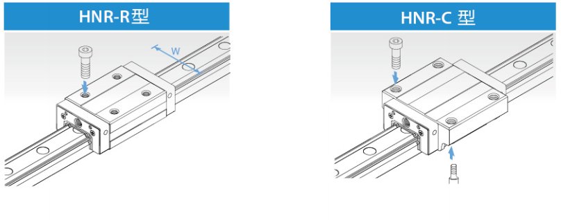 Con este tipo, el bloque LM tiene un ancho más pequeño (W) y agujeros con derivación. Se utiliza en lugares donde el espacio para el ancho de la mesa es limitado.